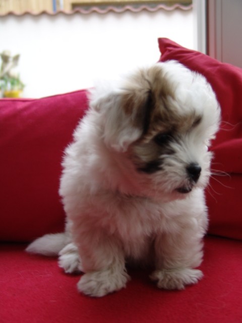Coton de Cologne, so genannt aufgrund des Flecks am Rücken, der aussieht wie ein angeknabberter Keks